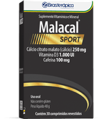 Malacal Sport c/30 Comprimidos - Malacal® Sport e um suplemento vitamínico e mineral com cafeína desenvolvido para suprir as necessidades diárias de cálcio e vitamina D3 do organismo A combinação balanceada de cafeína com cálcio garante: Auxilia na manutenção de ossos e dentes - Auxilia na coagulação do sangue - Auxilia no funcionamento muscular e neuromuscular - Auxilia no processo de divisão celular - Auxilia no metabolismo energético - A Vitamina D também auxilia no funcionamento do sistema imune - A cafeína auxilia no aumento do estado de alerta e na melhora da concentração - A cafeína auxilia no aumento da capacidade de resistência e no desempenho de exercícios físicos de resistência.